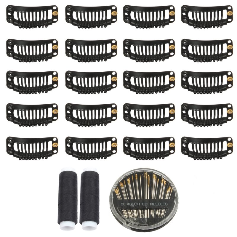 30pcs 9 Teeth Stainless Steel Snap Comb Wig Clips, Hair Extension Clips, Wig Accessories Clip with 30 Assorted Sewing Needles and 2 Rolls Thread (Black)
