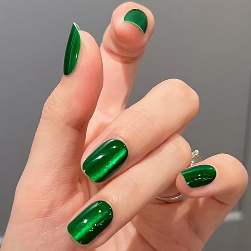 30Pcs Cat Eye Press on Nails Short Square False Nails Velvet Stick on Nails Emerald Green Nails Press on Acrylic Nails Glossy Glitter Fake Nails with Solid Color Design Squoval Glue on Nails for Women