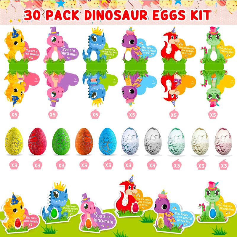- 【Awesome Hatching Dinosaur Eggs Set】Super value dinosaur birthday party favors include 30 colorful dinosaur eggs in 10 designs, 3 pieces of each style, 30 dinosaur-themed cards, 32 opp bags, and 1 gift box. These dino egg party favors are enough for a dinosaur birthday party and are sure to be hit at your kid's birthday party!