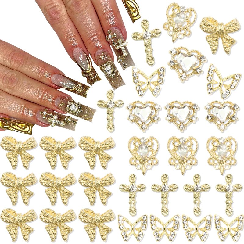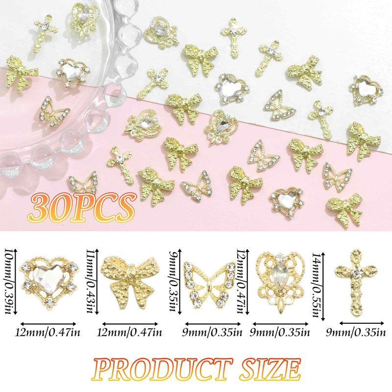 - Package Contain - You will get 30PCS 5styles gold nail charms, about 8pcs heart charms for nails, 6pcs butterfly charms,6pcs gold cross nail charms and 10pcs bow charms. Different types can meet your different nail art design