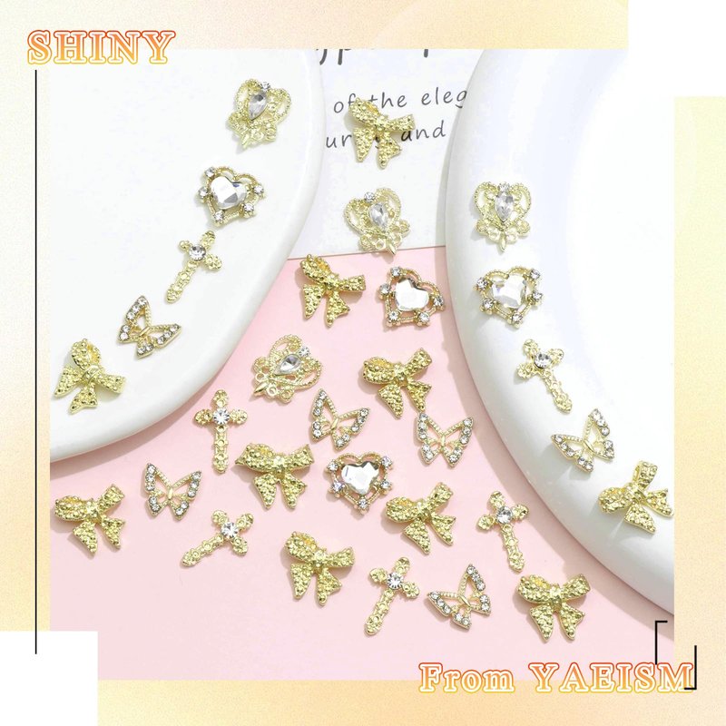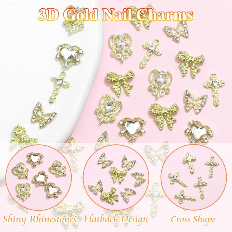 - Many Types of Gold Charms - These 3D gold charms for nails are composed of 5 types of elements, including heart, butterfly, cross, and bowknot. Suitable for nail art designers, you can use unlimited imagination to make them
