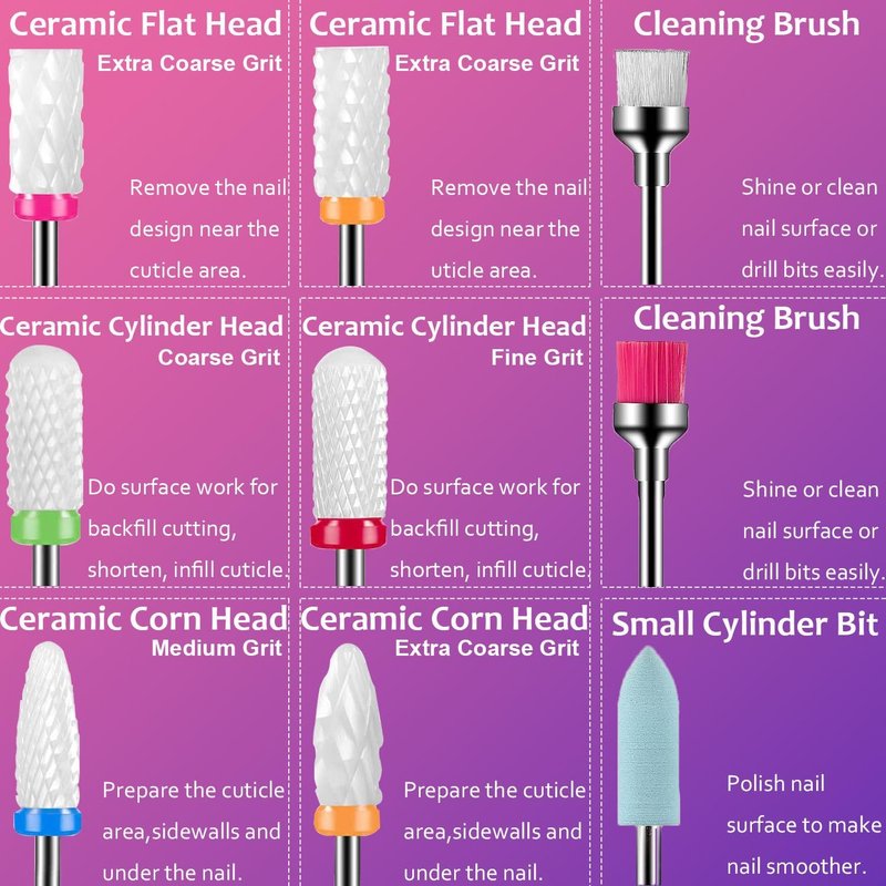 - 💅VALUABLE KIT: The 30 pieces drill bits set for nails includes corn bits, cylinder bits, barrel bits, needle bits, ball Bits, flame bits, nib bits and safety bits of different sizes, meet diversified needs. Suitable for any nail art work like removing cuticles and acrylic gel nails, grinding, polishing, sharpening, smoothing, carving.