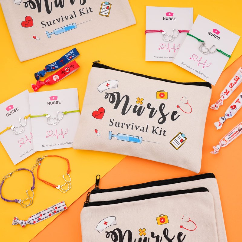 30pcs Nurse Appreciation Gifts Set Include 6 Nurse Survival Kit Canvas Makeup Bag,6 Nurse Blessing Card Bracelet with Greeting Card and 18 Nursing Hair Tie Elastic Ribbon Ponytail Holder