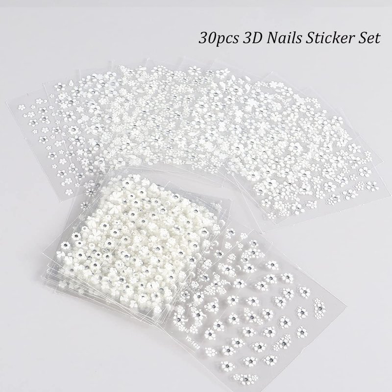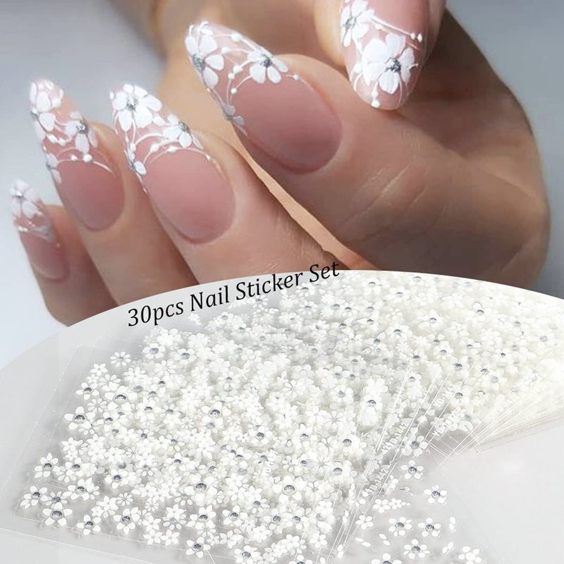 30Sheets Floral Nail Art Stickers Decals 3D Self Adhesive White Flower Designs Nail Supplies White Flower Stickers with Rhinestones Nail Decorations for Women Manicure Charms Transfer Tool Nail Wraps