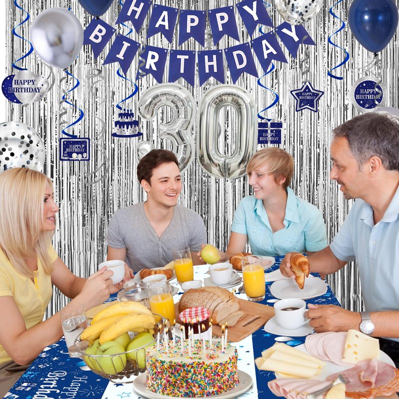 - ☑️ Mens 30th Birthday Decorations Navy Blue and Silver: 30th birthday party supplies includes 1 set HAPPY BIRTHDAY banner; 1pc blue Happy Birthday tablecloth; 2pcs silver fringe curtains; 6pcs silver hanging swirls, 6pcs blue hanging swirls, 6pcs blue pendants; 37pcs balloons in total, number 30 silver foil balloon, 15pcs navy blue latex balloons, 15pcs silver latex balloons, 5pcs silver confetti latex balloons; balloon ribbon, balloon inflated straw, balloon strip, balloon dot glue.