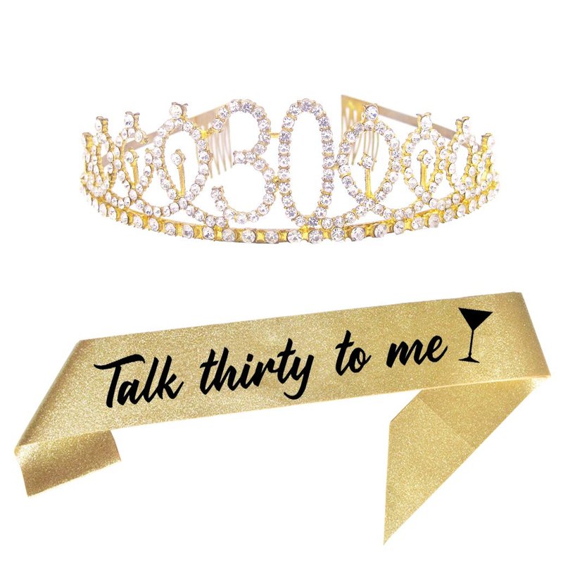 - The Perfect Birthday Party Set - Includes 1pcs Gold “Talk thirty to me” birthday sash and 30-year-old Gold tiara. It is a wonderful gift for the girl 30th birthday.