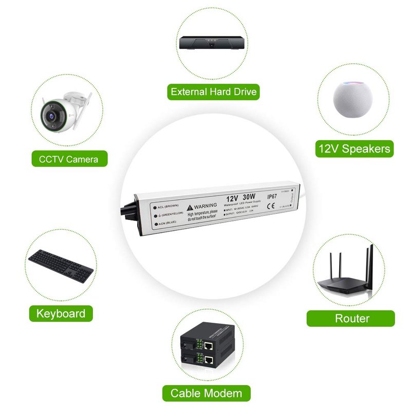- 【Widely Applications】Waterproof IP67 rated LED driver is intended for indoor and outdoor damp or wet locations, non-submersible. That can be used to power 12VDC constant voltage LED strip light, LED modules, RGB LED lights and other 12VDC LED landscape lighting projects.