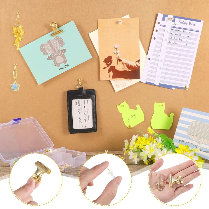- 【Easy to Use】Gold decorative thumb tacks can easily attach the product to the cork board and can be inserted directly, the thumb tacks with clips can hold the paper together without slipping, and the push pin hangers can also easily hang 20lb products, easy to use