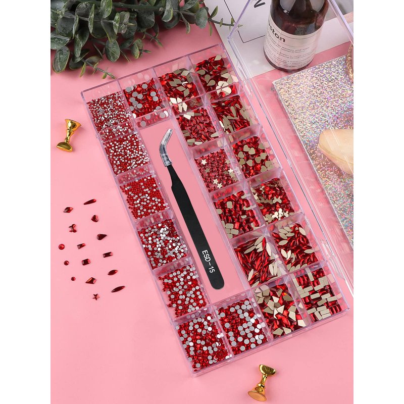 3100Pcs Red Rhinestones for Nails EBANKU Nail Art Rhinestones Kit Red Nail Crystal Rhinestones Mixed Shape with Rhinestone Picker Dotting Pen Tweezers for Valentine's Day DIY Nail Art Craft