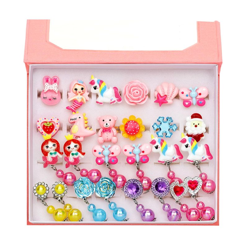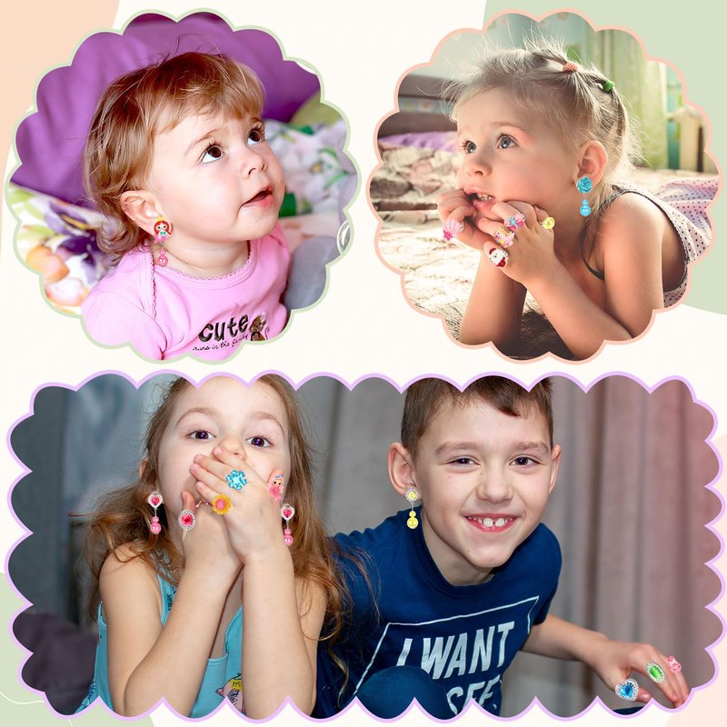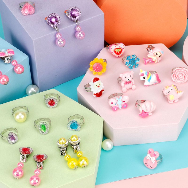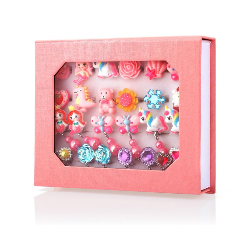 - Perfect Gifts for Little Girls: Wrapped in a charming pink gift box, these rings for girls and earrings make for ideal birthday gifts for girls, whether for daily wear at home, school, or costume party, tea party, friend's house, vacation, kids' dress up & pretend play, wedding ceremony or holidays like Halloween, Valentine's Day, Easter, Christmas and Thanksgiving. Featuring 24 unique designs in vibrant colors, toddler girl ring is perfect as princess party favors, gift bag fillers