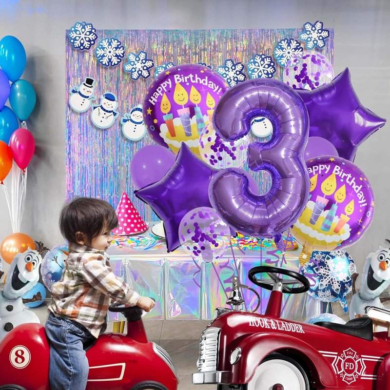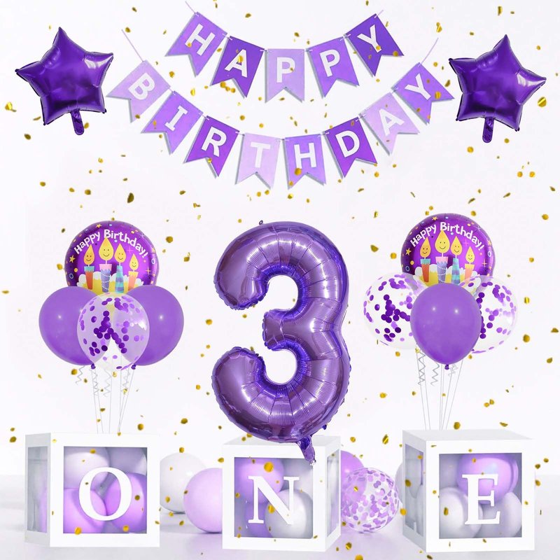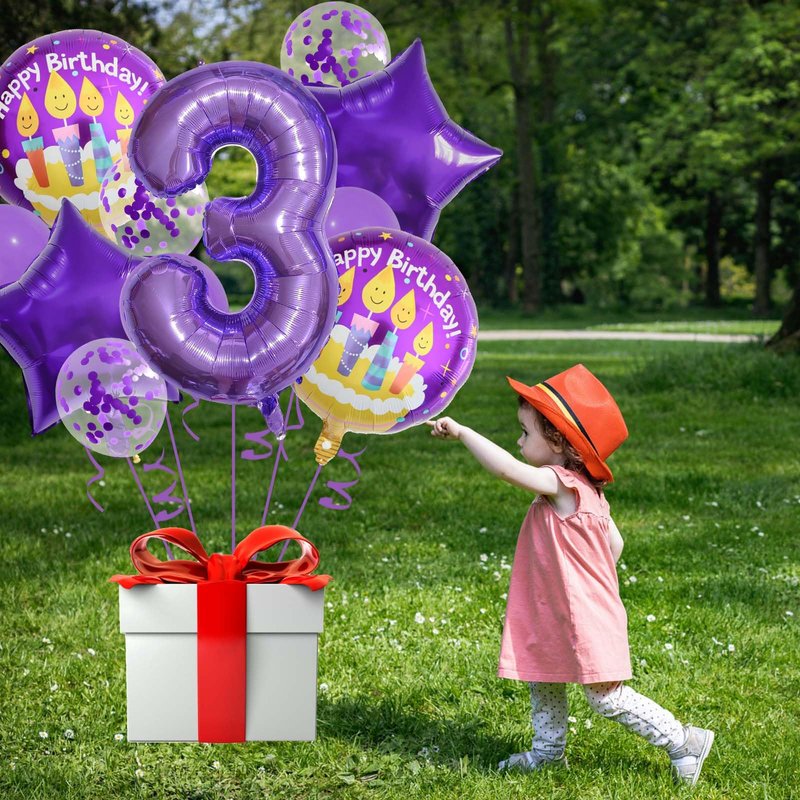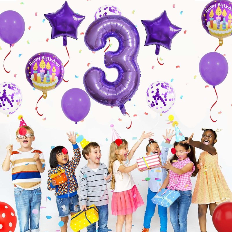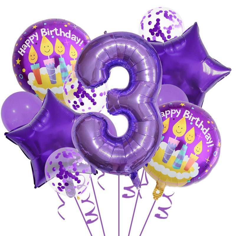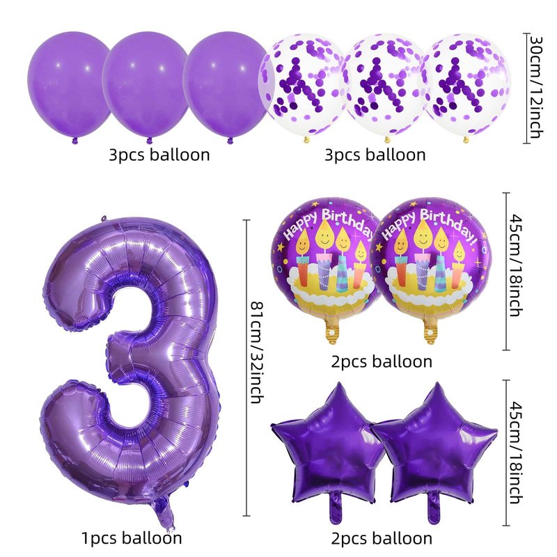 - What's Included - The package contains 1 pcs 32 inch foil number 3 balloon, 2 pcs 18 inch round balloons, 2 pcs purple five-star foil balloons, 3 pcs purple latex balloons, 3 pcs purple confetti latex balloons