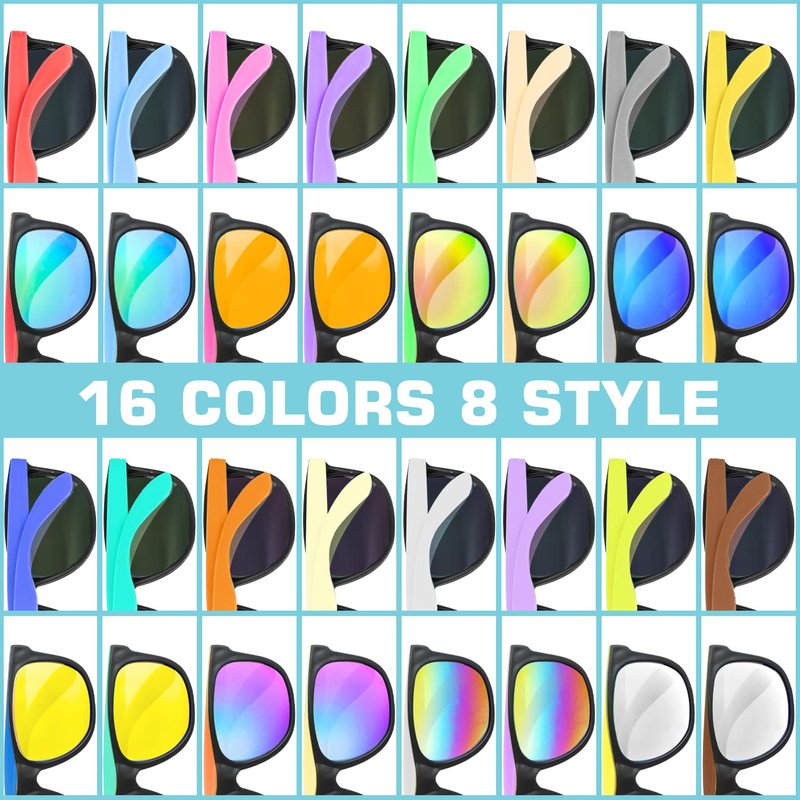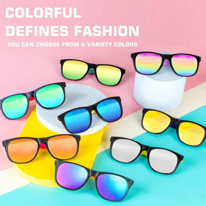 - Great Value for Money: There are 32 pack Sunglasses with 8 style mirror coating and 16 colors plastic frame, comes in red, orange, yellow, green, blue, pink and etc! The color mix works well for kid, teen and adult.