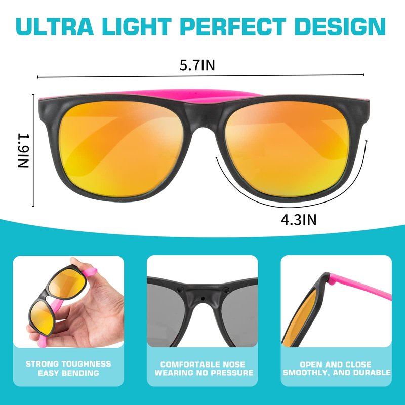 - Vintage 80's Design:The Sunglasses are made of comfortable and sturdy plastic. the safe and lightweight frame makes you hardly feel them on your face! Tuck it into goodie bags, treat boxes, or give them out as class prizes.