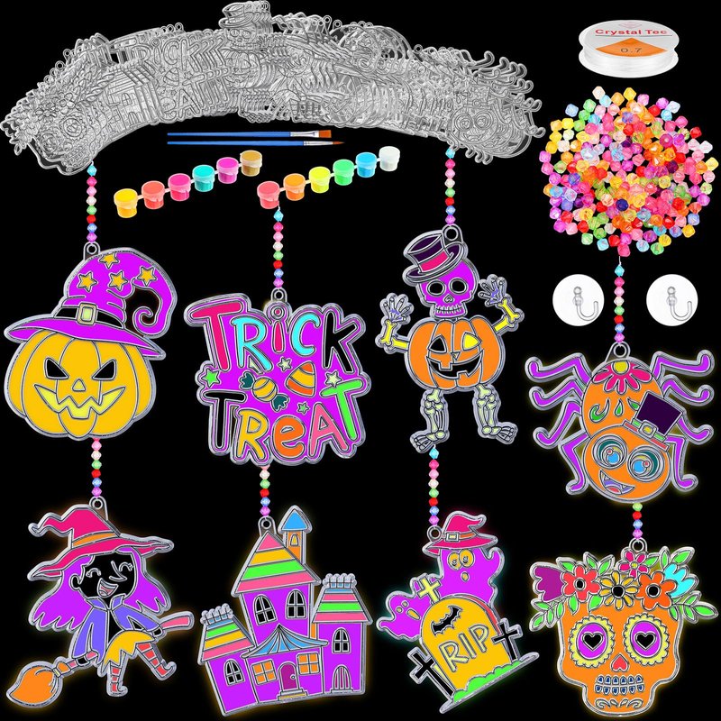 - Complete Halloween Art Creation Activities Set: the set includes 32 Halloween window stickers, 2 sets of six color liquid luminescent pigment, a pack of 200 acrylic beads, 32 clear sticky hooks, and a roll of cord; Create interesting scenes for your Halloween festivities