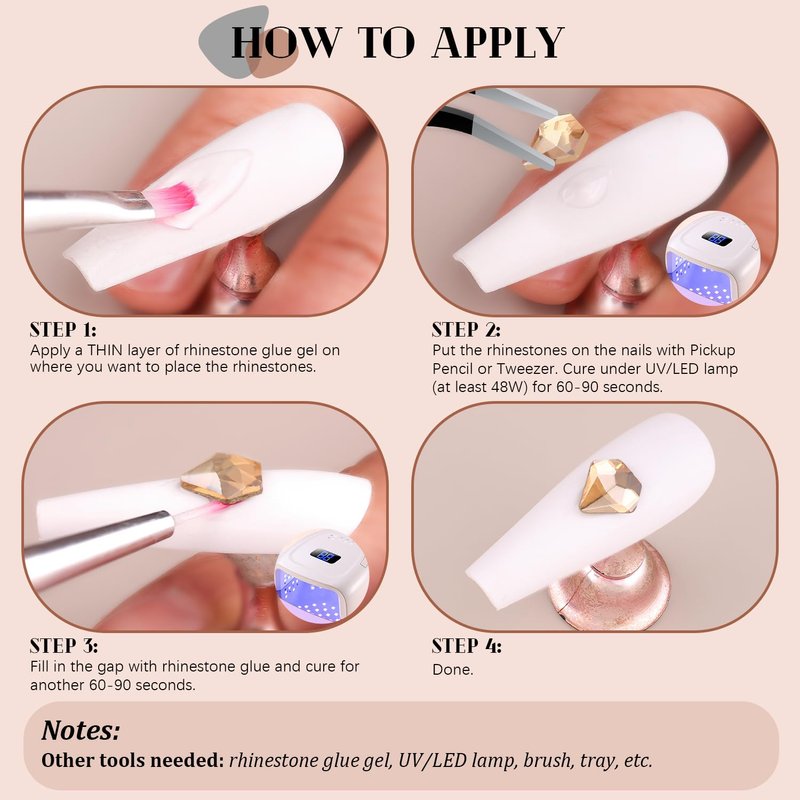 - 💎EASY TO USE -- Easy to apply on artificial nails. After applying nail polish and applying enough gel on the nails, simply use the equipped tools (pickup pen + tweezers) to pick up the crystals onto your nails to create your fabulous DIY designs! These crystals gemstones are different from those hotfix stones, they are not self-adhesive, you have to apply glue to stick them (glue is not included.)