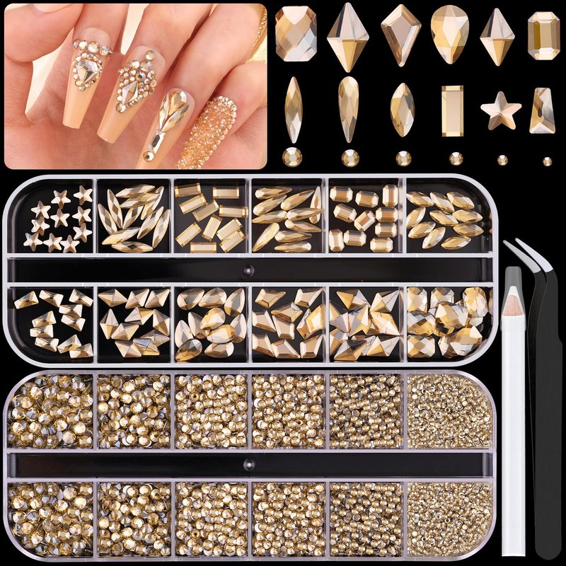 - 💎PACKAGE CONTENT -- The package contains 120Pcs multi shapes flatback gems crystal and 3100Pcs 1.5-4mm round beads, totally 3220Pcs Champagne Gold rhinestones. Additionally, 1 tweezers for large size gems and 1 pickup pen for small size gems. This rhinestones kit makes it easy for you to make any nail art you like, and will bedazzle your acrylic nails!