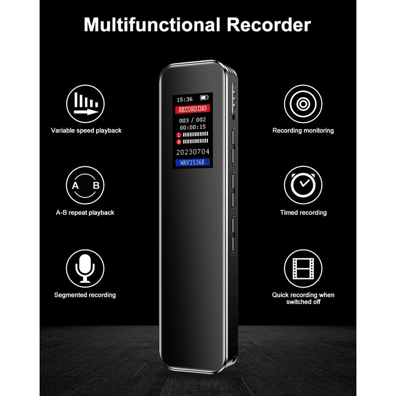 - 【Multi-functional Mini Voice Recorder】: Experience the ultimate functionality with our sound recorder. It supports 6 languages, offers A-B repeat/loop playback, timer recording, segment recording, monitoring, timer shutdown, password protection, sound effect settings, timer auto recording, variable speed playback, and intelligent noise reduction.