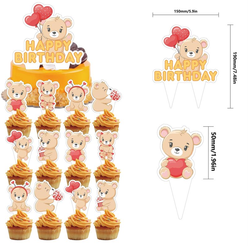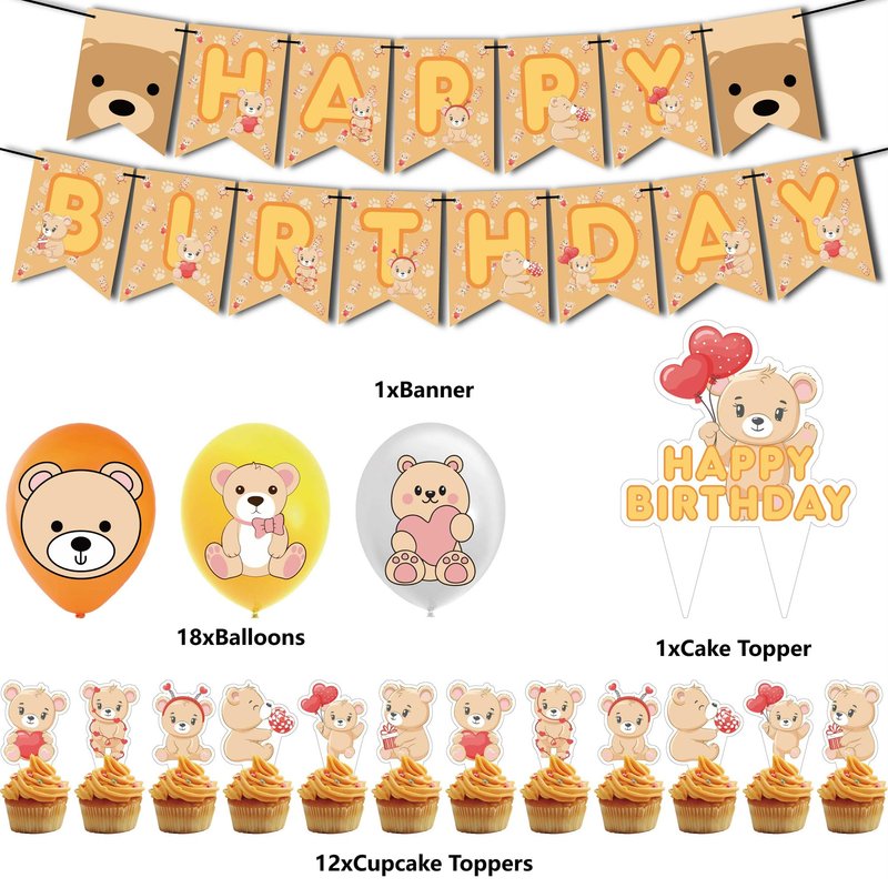 - Bear Birthday Party Decorations Kit: Package includes 1 x birthday banner, 1 x big happy birthday cake topper,18 x latex balloons, 12 x cupcake toppers,have a cool party for kids.