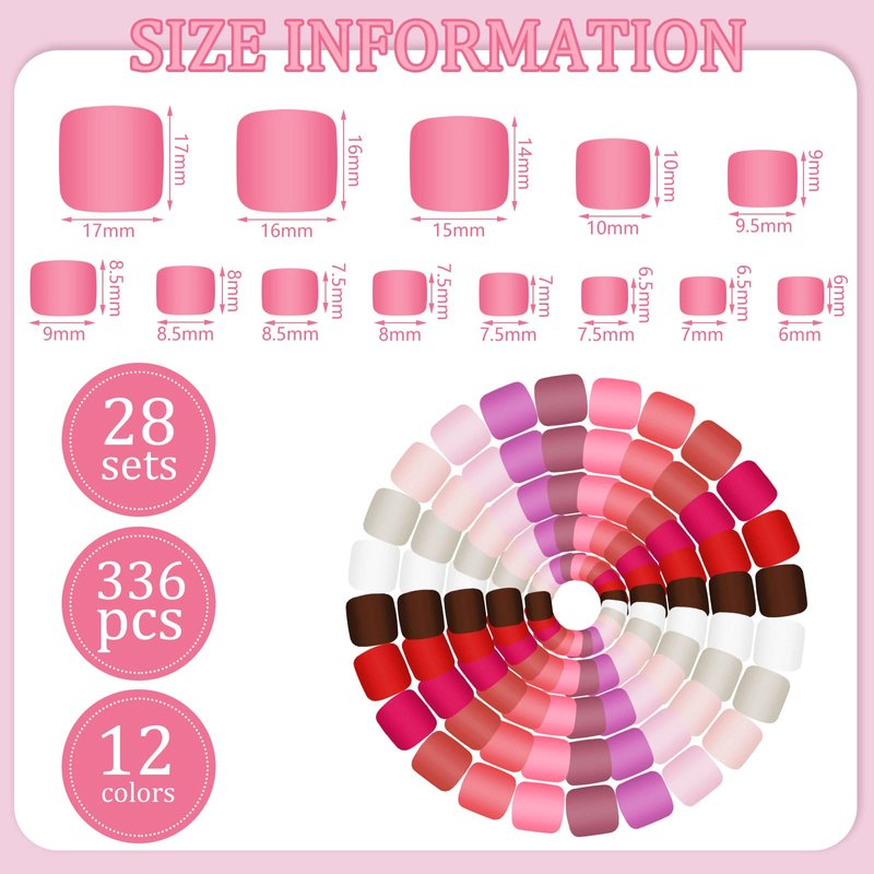 - Bright color combination: we provide you with 336 pieces of false toe nails in assorted colors, each set contains 28 pieces of nail tips in 14 various sizes, you can choose the proper color to match your outfits and makeup, the adequate number and colors will meet your multiple DIY and replace needs in daily life