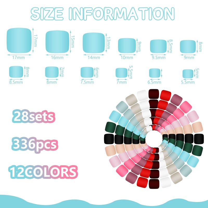 - Bright color combination: we provide you with 336 pieces of false toe nails in assorted colors, each set contains 28 pieces of nail tips in 14 various sizes, you can choose the proper color to match your outfits and makeup, the adequate number and colors will meet your multiple DIY and replace needs in daily life