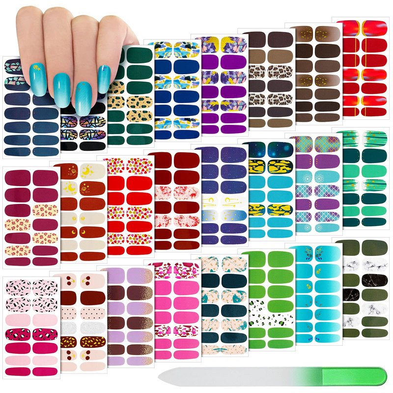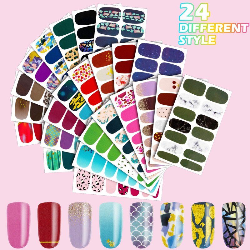 - Package includes: there are 24 sheets full wrap nail stickers in different styles and sizes in a package, each sheet accounts for 14 pieces nail decals, total in 336 pieces; And there is 1 piece nail file in the pack, which IS enough to fit most people's fingers and allow you to design a variety of styles of nail works