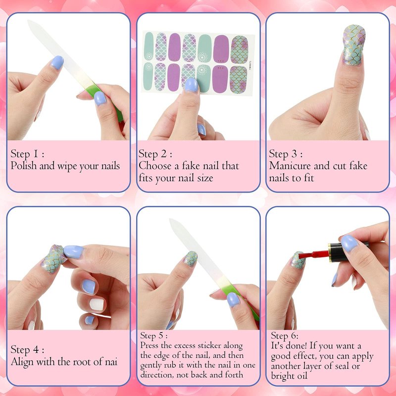 These nail art decal strips are self-adhesive, can be stuck directly on nails, convenient for both beginners and experienced ones. Firstly, clean your nails, then choose the suitable size of nail sticker that fit your nail, and stick on, finally, file the extra part fully and smooth the surface, an exquisite nail art is done. If you want to keep long time, you can apply a layer of gel on it, and light for seconds.