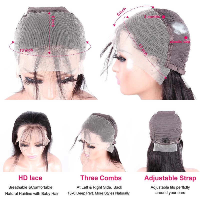 - Wig Cap: HD Straight Lace Front Wigs Human Hair, Natural Color,150% Density, 240 Gram,3 Combs Inside To Secure, 21.5-23.5 Inch Medium Cap With A Stretched Elastic Band To Adjust The Cap Size. Use Of High-Quality Rose Nets Makes It More Breathable And Makes It More Comfortable For Our Heads.