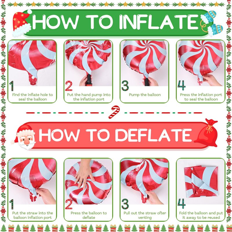 - Repeated Use: The Christmas candy cane and gift box balloons kit contains a straw that can be used to deflate the xmas foil balloon, simply insert the straw into the valve and press gently until the gas is completely expelled. After use, it can be folded and stored for reuse.