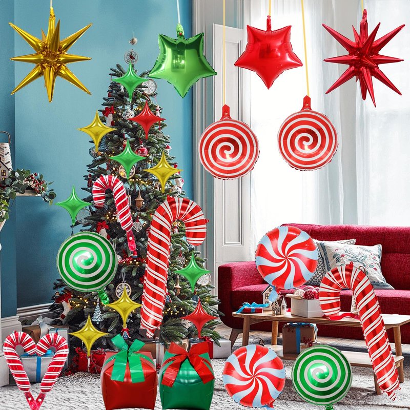 - Perfect Size & High Quality: These shiny and cute Xmas candy cane and gift box explosion star balloons are made of high quality aluminum foil, all the balloons are safe, durable, non-toxic, strong and light. The globos de navidad can be reused. Just fill 90% of the balloon that could allow the balloon to expand completely.