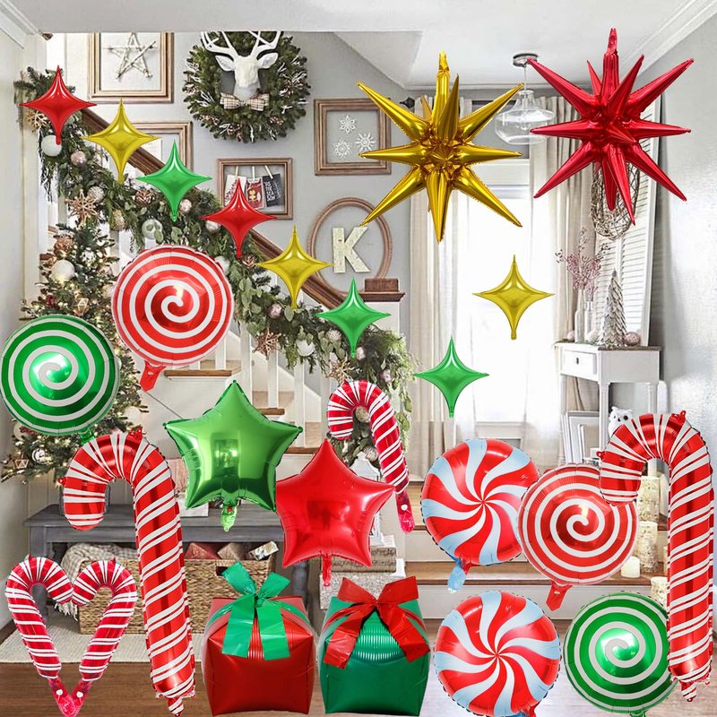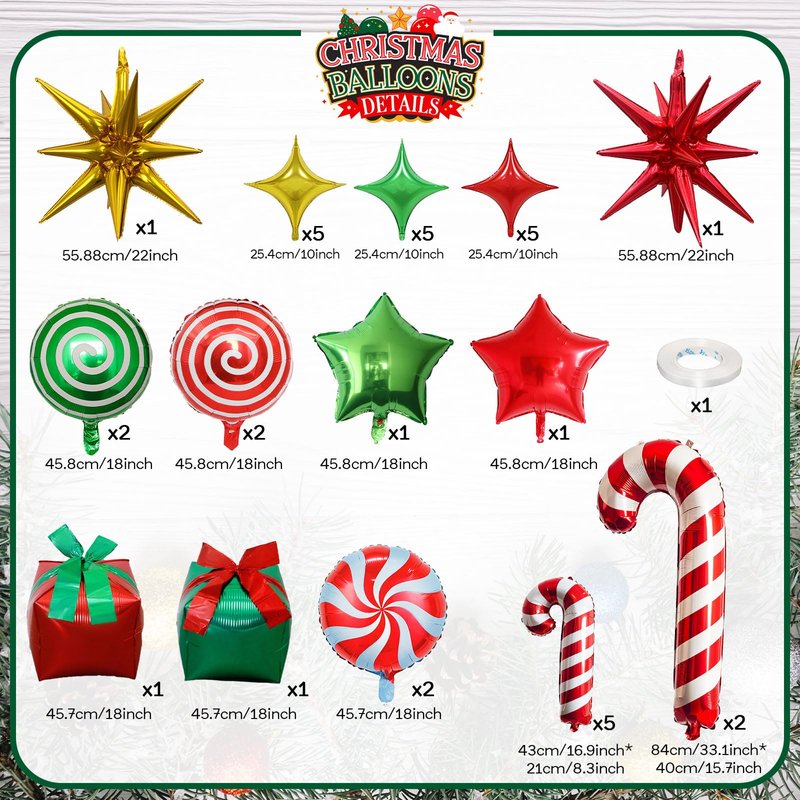 - Sweet Christmas Foil Balloons: You will get 34pcs Christmas candy cane, gift box and star mylar foil balloons, include red round candy balloons 4pcs (2 styles), green round candy balloons 2pcs, 33*15.4" candy cane balloons 2pcs, 17*8.3" mini candy cane balloons 5pcs, 18" gift box balloons with ribbon 2pcs(red + green), 18" star balloons 2pcs (red + green), 22" explosion star 2pcs (red + gold), 10" star 15pcs (red + green + gold), Perfect for decorating Christmas candy theme party.