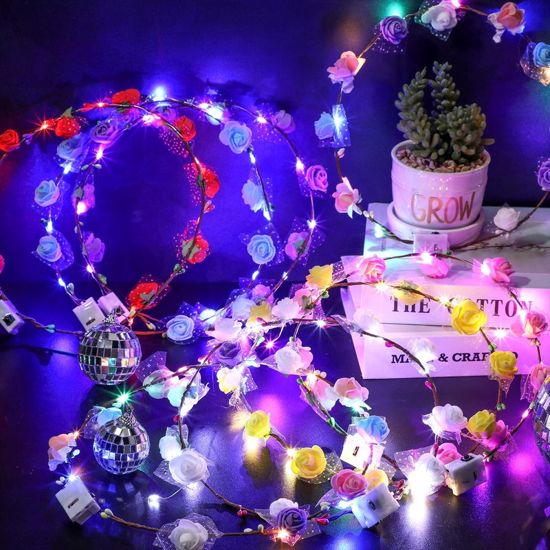 - 7 Colors and Proper Size: light up flower crowns are made of foam rose, flexible cords and LED lights, the circumference of light up crown is about 65 cm/ 25.59 inch in diameter, can be adjusted manually according to head circumference, fits most adults and children