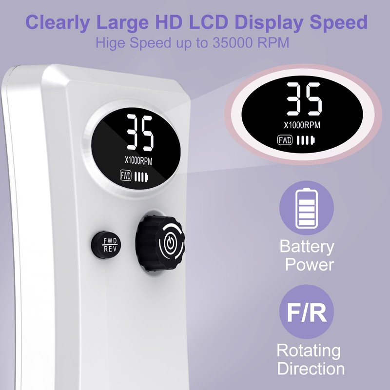 - 【Easy to Operate】One-touch button supports to display power and change forward/reverse direction with speed showing on the LCD screen, both professionals and beginners could operate this nail drill machine easily. Professional nail grinder makes the filling and removal of acrylic easier.