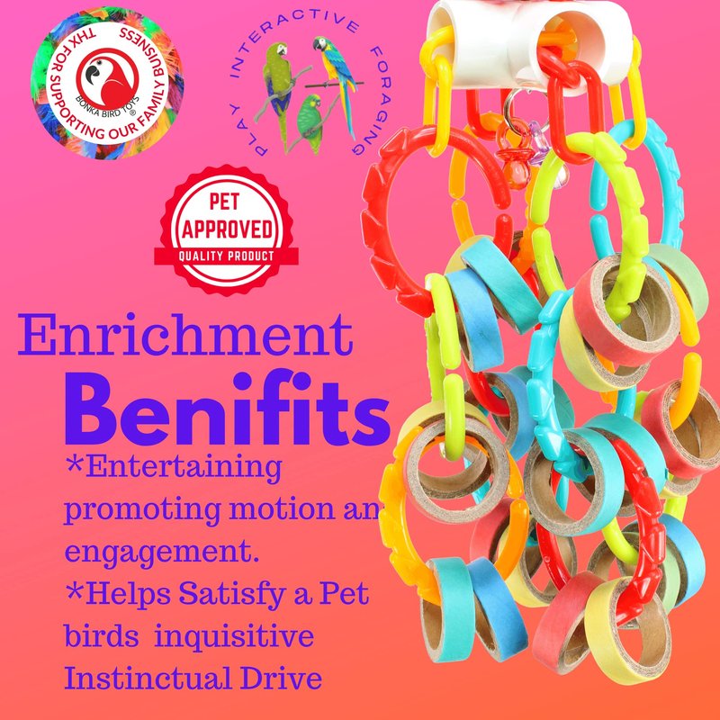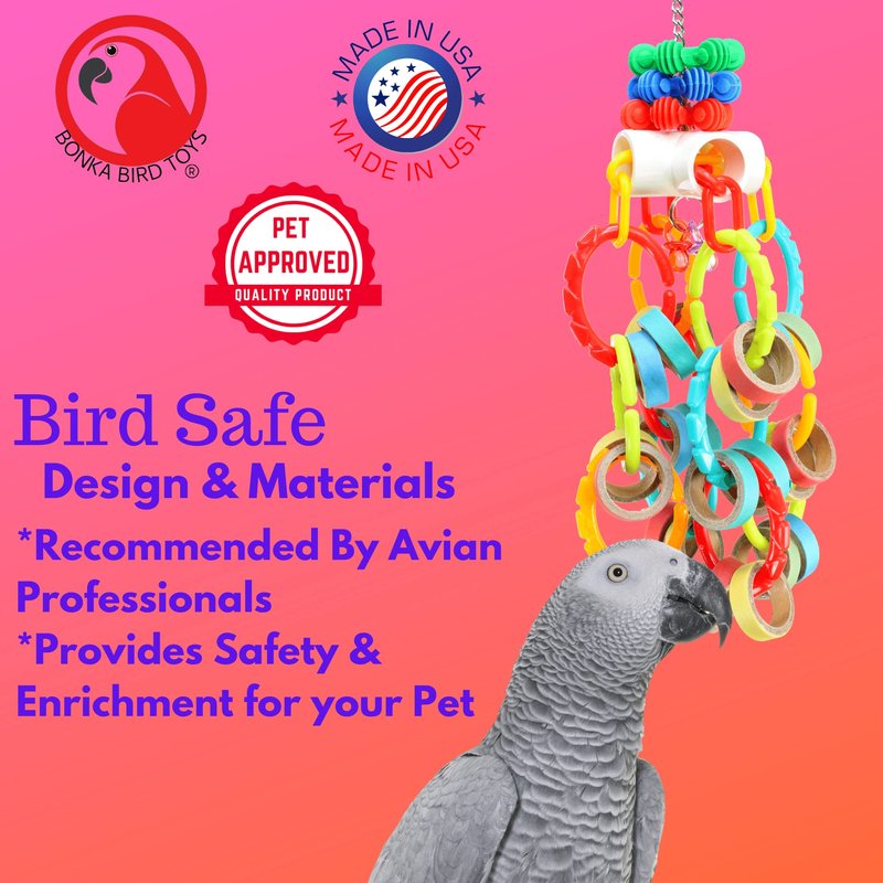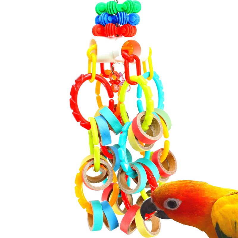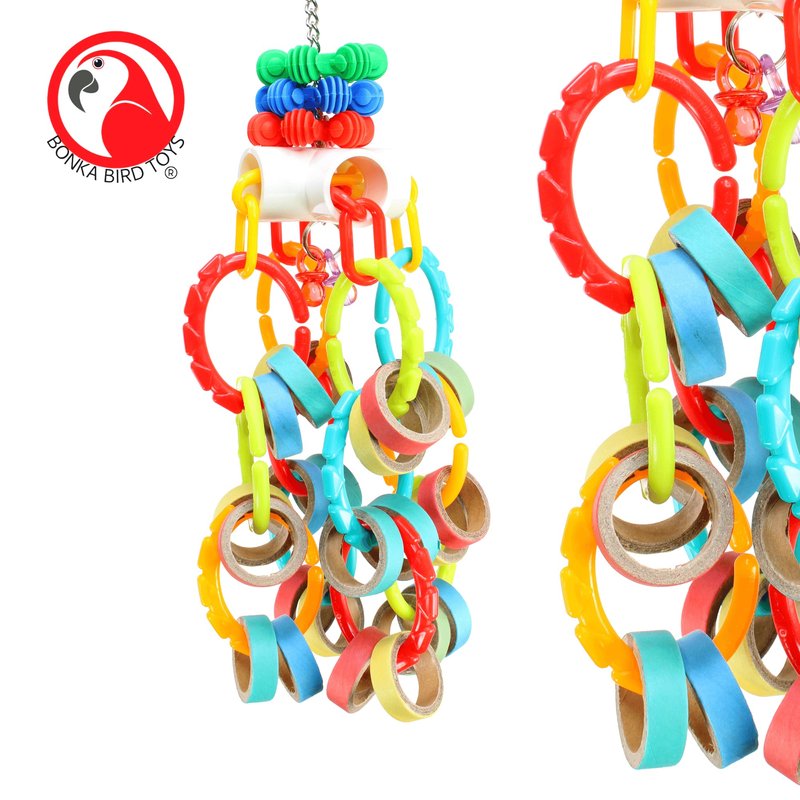 The 3551 Bagel Waterfall from Bonka Bird Toys is a chewable and colorful medium sized bird toy. This varied bird toy has lots of assorted parts to keep your feathered friends beak and feet happy! The top of the bird toy has a quick link connector for fast hanging in the aviary. A sturdy link chain hangs from the connector passing through a drilled hole in the 4-way plastic joint and ending with a sturdy metal ring. This metal ring has (2) colorful translucent acrylic pacifiers hanging from it. Adorning the link chain and sitting on top of the 4-way pass through are (3) colorful interstars. These items are great fun for pets to investigate with their beaks and feet. The 4-way plastic joint has (2) colorful plastic link chains strung through it passing through all its openings. These link chains dangle colorful plastic C-links that each have (2) small colorful chew bagels hanging. The chew bagels are made from compressed cardboard and are super fun for pets to grab and shred. As they interact with this bird toy it will move all about making a wild time in the cage. With all of its C-links you can also easily add more materials to the toy to increase the fun. The 3551 Bagel Waterfall is 100% bird safe¬and weighs and measures approximately: Height:¬(13) inches Width:¬(5) inches Weight:¬Under (14) ounces * Shreddable bird enticing medium sized toy. * Lots of chewable colorful cardboard bagels. * Pullable plastic chain legs. * 100% bird safe.