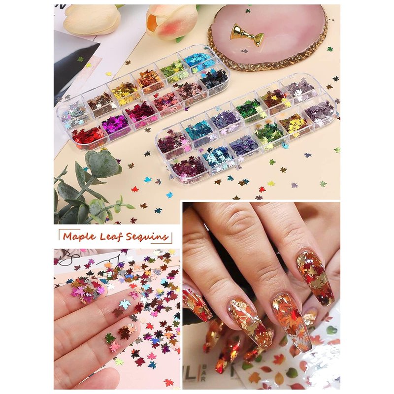 - 🍁 Sparkly Maple Leaf Nail Art Sequins - 12 different colors of maple leaf nail sequins! They are red, gold, green, silver, purple, black, pink, orange, blue, brown, yellow, etc. Maple leaf sequins with holographic effect.and the maple leaf nail sequins can be safely worn on the skin.Also can be used with hair gel or glitter primer to keep your sparkles stay longer, easy to remove with water.