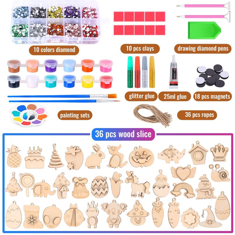 - Package Includes: you wil get 36pcs wooden crafts with 36pcs ropes, 12 colors acrylic paint with 2 brushes and a mini palette, 18 self-adhesive magnet stickers, 4mm diamonds of 12 colors a total of 2400pcs, 2pcs diamond pens, 10pcs clay , 1pcs diamond tray and a plastic box,rich diy accessories to meet your creative needs