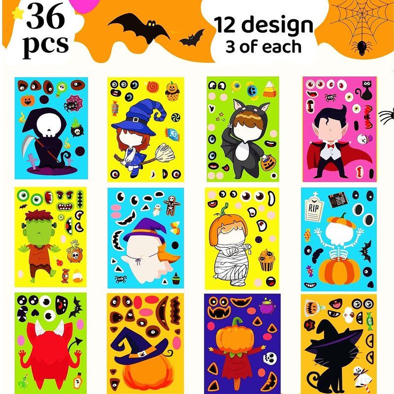 - 【12 Styles Halloween DIY Stickers】Including 36 sheets Halloween theme stickers(per style 3 sheets, 12 styles in total). Each sheet boasts at least two face options, allowing kids to mix and match various designs to craft characters that suit their fancy. From zombie, vampire,mummies, reaper and ghost, pumpkin, cat, bat, to monster, witch, the range of decorations will surely spark their creativity. The extra face option included can be used as pumpkin decorating kit to transform small pumpkins into charming Halloween decorations.