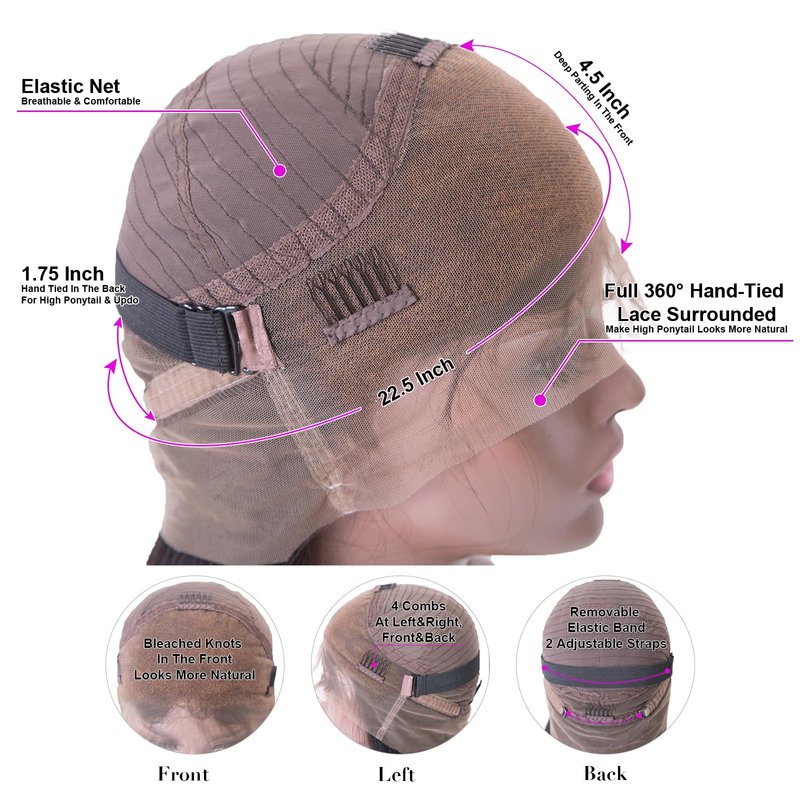 - KUN Hair 360 Lace Wigs Human Hair Pre Plucked Cap Size: Medium Size Cap(22±0.5 Inches) Available with 2 Adjustable Straps, 4 Combs, the New Wig Cap with A Removable Elastic Band, It will Let Your Wig Fit Snugly and It won’t Lift Up, Match Your Head Perfectly, Also No Glue, No Tape Necessary, Very Friendly for Beginners.