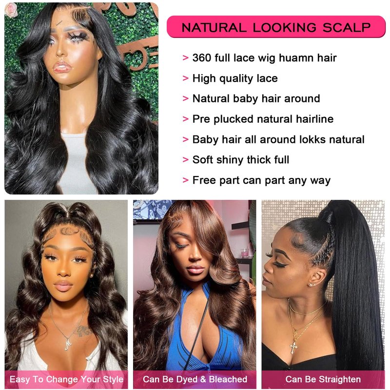 - 360 Lace Front Wigs Pre Plucked Advantages: 360 Lace Frontal Wigs Human Hair Pre Plucked 150% Density With Baby Hair, Can Be Middle Part, Side Part, Any Part as You Like, Can Make High Ponytail & Bun, Can be Dyed, Straightened and Restyled as you like.