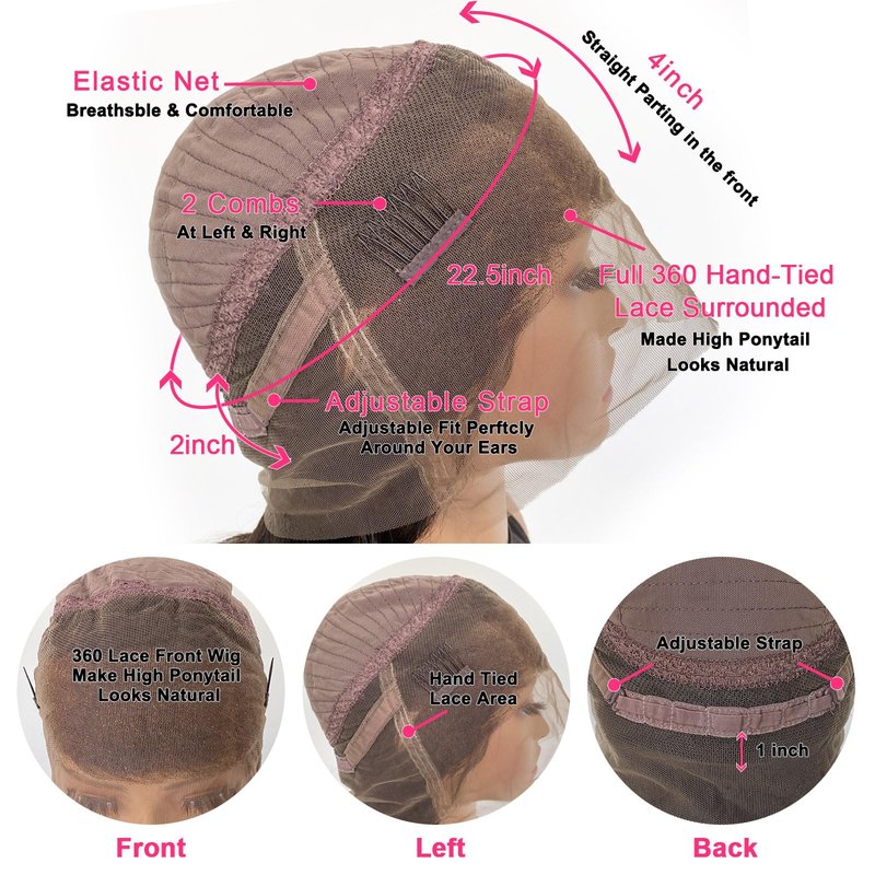 - 360 Wig Human Hair Full Lace Wig Cap:360 Lace Front Wigs Human Hair 150% Density, Breathable and Comfortable Medium Wig Cap Average Size(22-22.5 Inch ), Parting Space in Front with Adjusted Straps to Fit Almost Heads& With 2 Combs to Fix Well, You Can Wear or Take it Off Freely