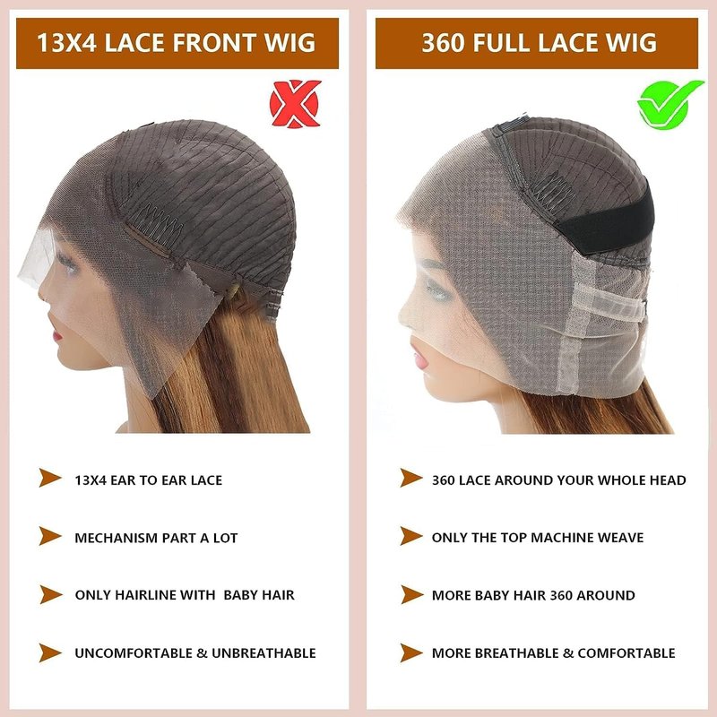 - ð§¡ãUpgraded 360 Full Lace Frontal - Ultimate VersatilityãUnlike smaller closure or 13x4/13x6 frontal wigs, the 360 HD transparent lace provides a full 360-degree coverage with baby hair around your whole head. So you can Part It Anywhere, Style it into High Ponytails, Buns, Updos or any creative look you desire, giving you the freedom to change your hairstyle effortlessly.