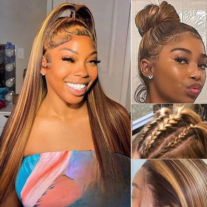 - ð§¡ãCharming P4/27 Highlight ColorãThis 360 lace wig features a stunning blend of Medium Brown (#4) and mostly 30% Honey Blonde (#27) gold highlights. Enchanting & Shiny. The perfect color combination adds depth and dimension to your look, enhancing your natural beauty and ensuring you stand out with a chic and modern style. PUT IT ON, BE UNFORGETTABLE.