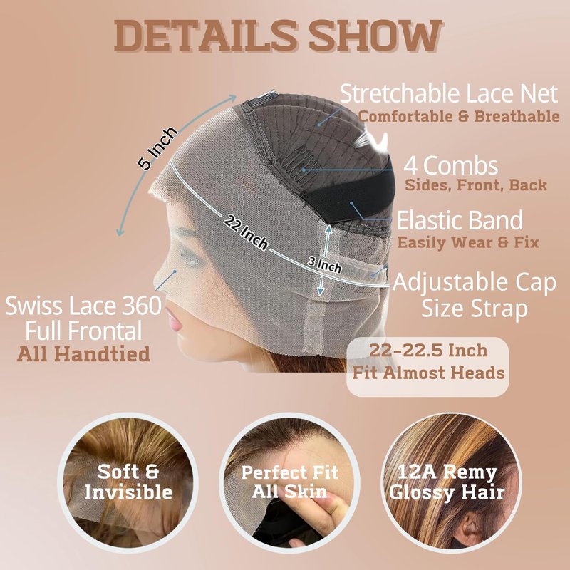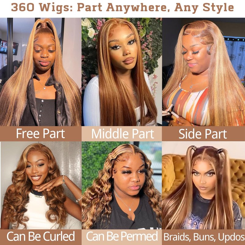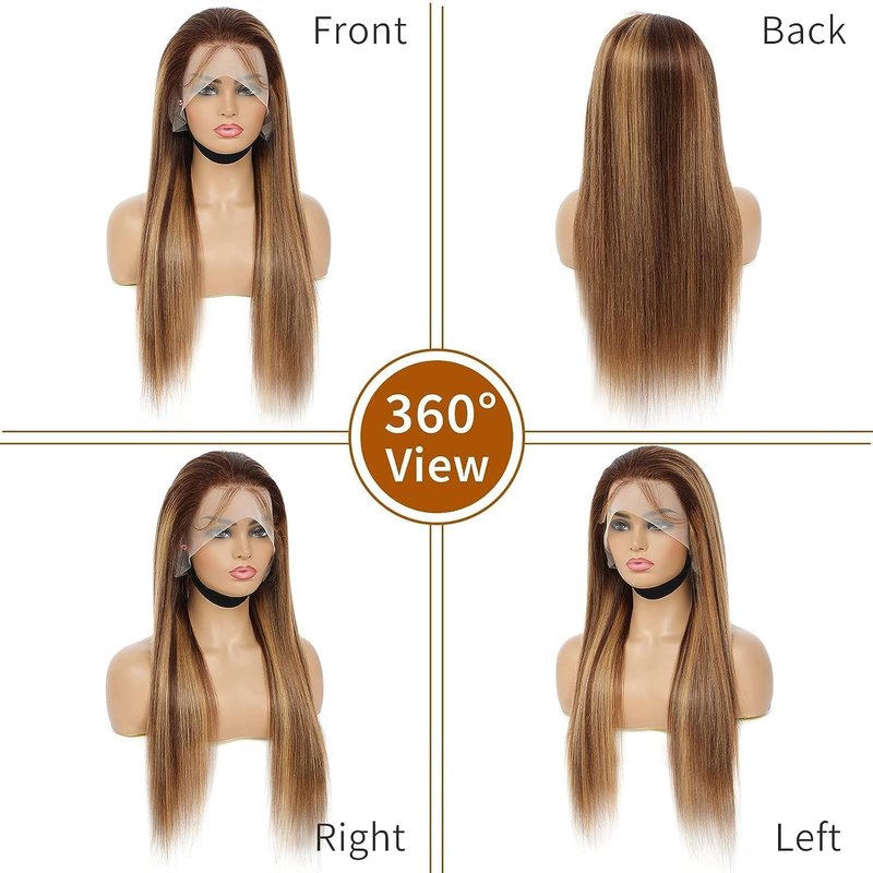 Honey Blonde Highlight 360 Straight Body Wave Wavy Curly Deep Wave Wig Human Hair Ombre Brown 4/27 Colored Lace Front Wig Full 360 HD Transparent Lace Brazilian Human Hair Wigs for Women Free Part Pre Plucked 150 Density 18 InchãUpgraded 360 Full Lace Frontal - Ultimate VersatilityãUnlike smaller closure or 13x4/13x6 frontal wigs, the 360 HD transparent lace provides a full 360-degree coverage with baby hair around your whole head. So you can Part It Anywhere, Style it into High Ponytails, Buns, Updos or any creative look you desire, giving you the freedom to change your hairstyle effortlessly.ã12A Grade Remy Human HairãOur 360 lace frontal wig is made from 100% 12A Brazilian human hair, collected from young donors. No deform and shedding free after washing, no tangles, no smell, clean & healthy, silky & soft. You can bleach, straighten, and restyle it just like your own hair! EXPERIENCE UNPARALLELED COMFORT.ãCharming P4/27 Highlight ColorãThis 360 lace wig features a stunning blend of Medium Brown (#4) and mostly 30% Honey Blonde (#27) gold highlights. Enchanting & Shiny. The perfect color combination adds depth and dimension to your look, enhancing your natural beauty and ensuring you stand out with a chic and modern style. PUT IT ON, BE UNFORGETTABLE.ãComfortable & Adjustable FitãFeaturing a 360 HD transparent lace front, our wig mimics a natural hairline with pre-plucked, lightly bleached knots, with breathable invisible lace softer & lighter than others. 150% density is finest fullness. Medium Cap Size 21-22.5" with 4 combs, 2 straps & 1 extra sizing band to secure & easy wear.ãA Wise Investment In Your Beauty RoutineãWhether youâre aiming for a sophisticated updo or a casual, loose hairstyle, itâs perfect for daily wear, special occasions, weddings, parties, and even professional settings. Durable construction is to last over 1.5 years with good care.The flexibility to switch between different styles makes it an essential addition to your beauty arsenal.
