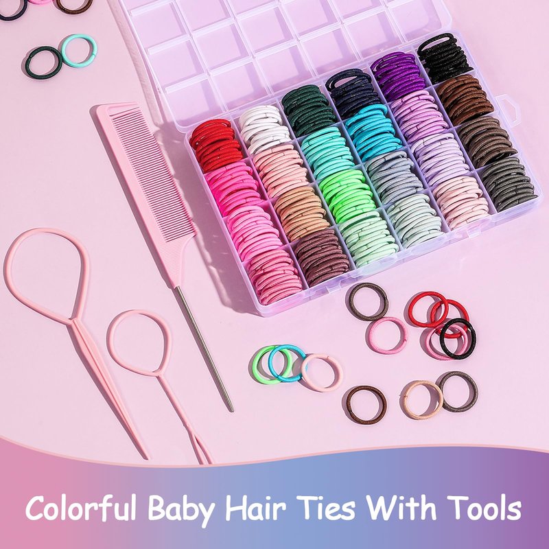 360PCS Elastic Hair Ties, Small Ponytail Holders with Clear Organizer Box, No Crease Hair Ties for Kids Girls Baby Toddle, 24 Colors Hair Ties with Hair Tail Tools, Rat Tail Comb, Kids Hair Accessory