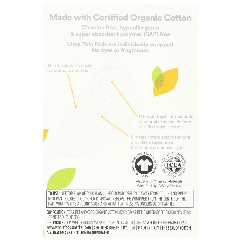 365 by Whole Foods Market, Ultra Thin Pads with Wings, Regular Absorbency, Made with Organic Cotton, 10 Count