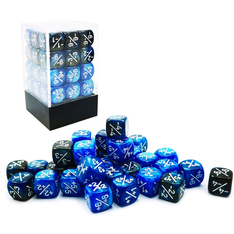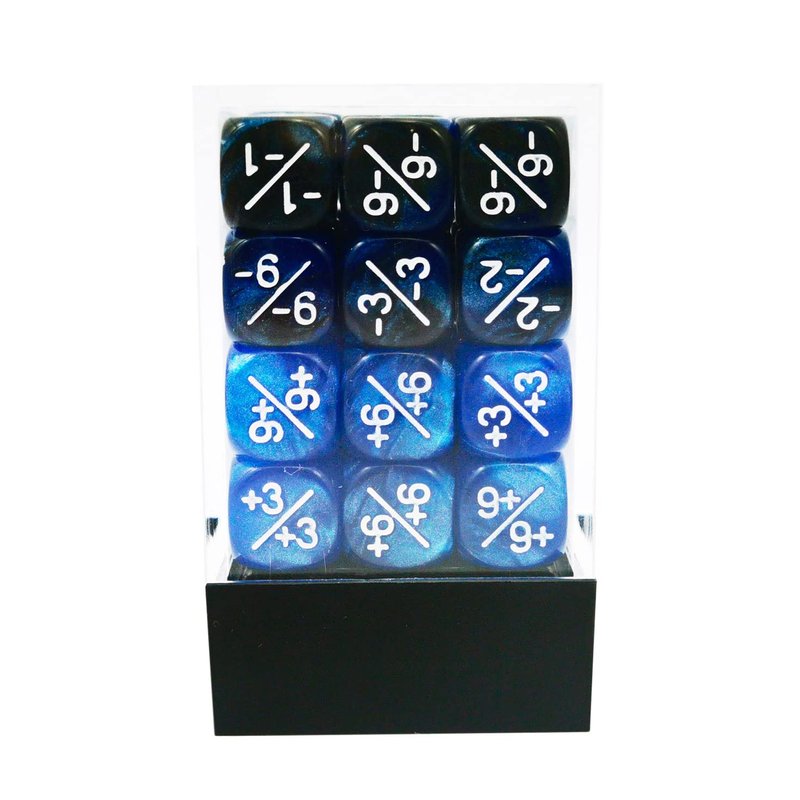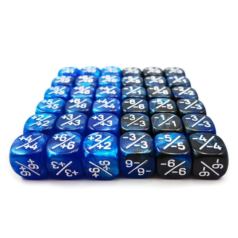 - 36pcs 12MM D6 set comes with 36 pieces of dice counters, including 18 pieces marble blue positive dice counter and 18 pieces gemini blue&black negative dice counters;