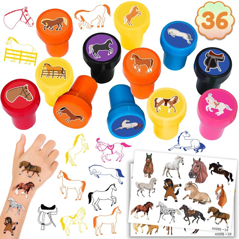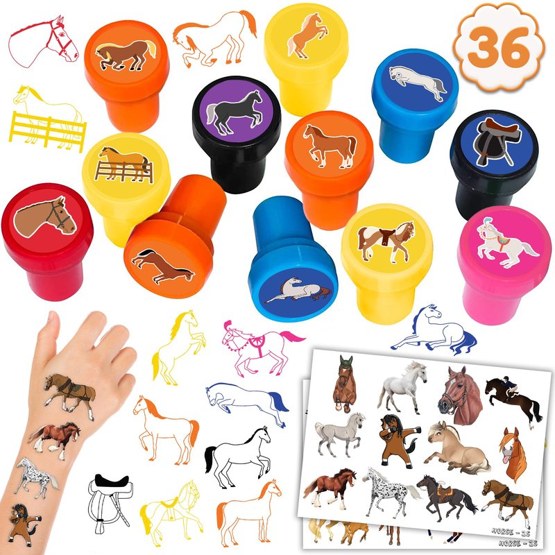 36PCS Horse Party Favors 24 Tattoos Sticker 12 Stamp Set - Ideal Horse Racing Painting Themed Birthday Decor Supplies Goodie Bag, Classroom Gifts, Cute Rewards for Girls, Baby Shower Prizes
