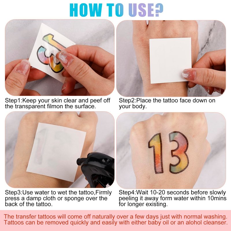 - Easy to Apply: Firstly, clean your skin where you want to stick; then remove the transparent film, place the tattoo face down on the skin; next, flap the tattoo with wet tissue for 10-20 seconds; lastly, remove the backing. You will get desired 13 number tattoo.
