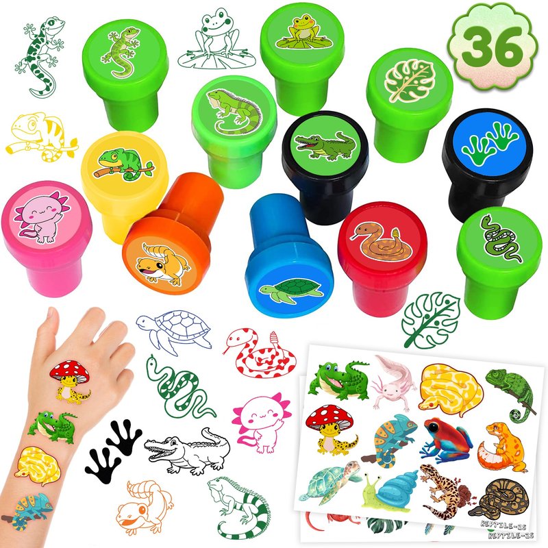 36PCS Reptile Party Favors 24 Tattoos Sticker 12 Stamp Set - Ideal Reptile Themed Birthday Decor Supplies Goodie Bag, Classroom Gifts, Cute Rewards for Girls, Baby Shower Prizes