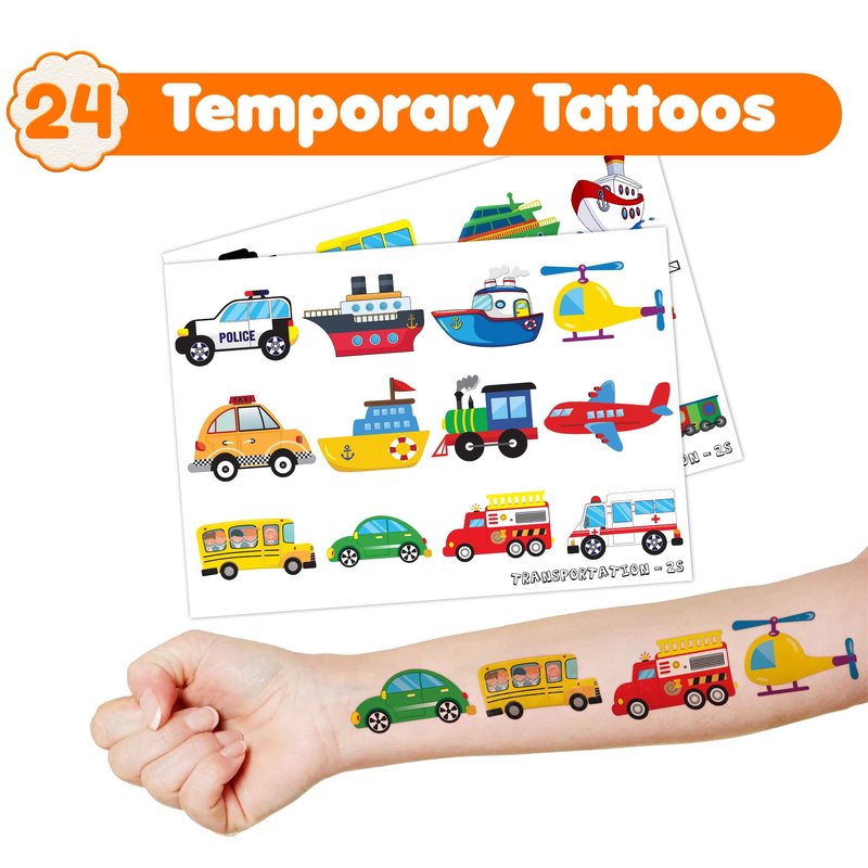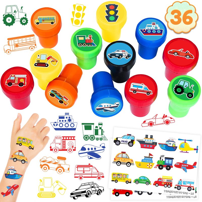 36PCS Transportation Party Favors 24 Tattoos Sticker 12 Stamp Set - Ideal Car Train Plane Themed Birthday Card Decorations Supplies Goodie Bag Cute Rewards for Boys Classroom Gifts Baby Shower Prizes