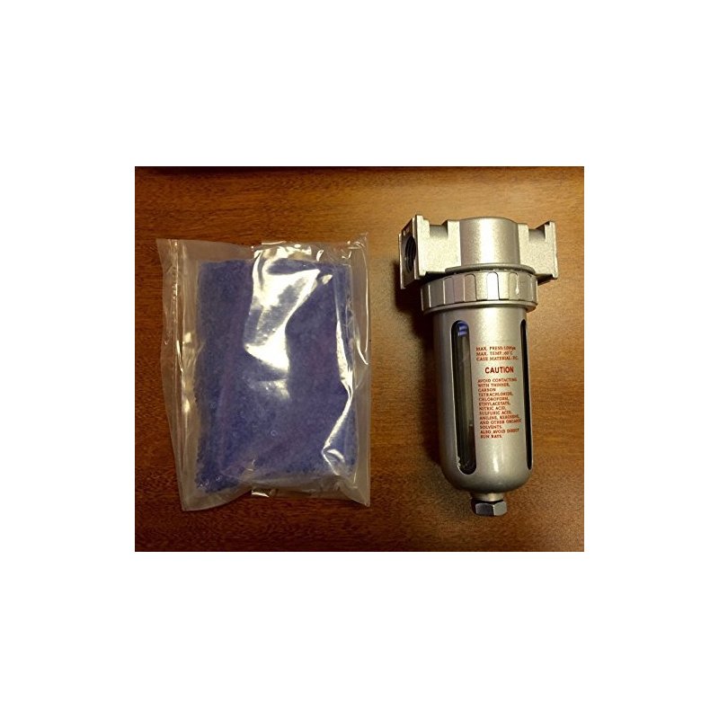 Brand new 3/8" NPT compressed air moisture filter desiccant dryer unit. Also included is two refills of desiccant beads. This filter / desiccant dryer removes water, oil and humidity from compressed air. The desiccant bead dryer will remove water and humidity in the compressed air. These desiccant beads change color from blue to a light pink when they are saturated and need to be changed. This has a quick release bowl for easy maintenance, also the bowl is clear and has a metal guard that provides easy viewing for contents as well as providing impact protection. Great for painting, plasma cutters, sandblasting and more! Specifications: Max pressure: 150 PSI Air inlet and outlet: 3/8" Female NPT Total filter Width: 3" Total filter height: 8" Filter is directional flow and is marked; each port is marked In & Out.